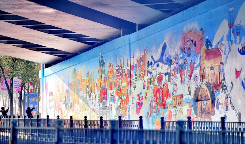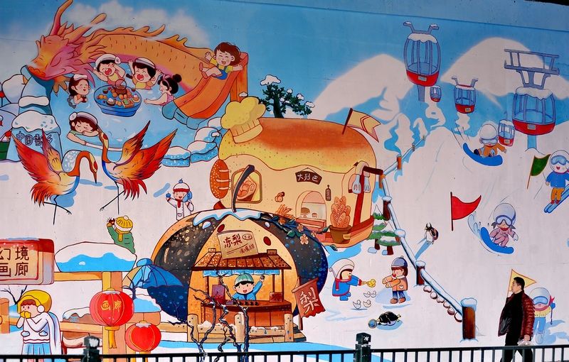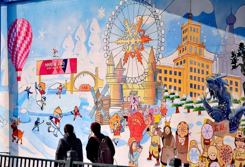 2024年11月11日,哈爾濱火車站北廣場(chǎng)附近,近54米長(zhǎng)、7.5米高的亞冬主題彩繪墻已制作完成,成為一處新的打卡景點(diǎn),吸引許多游客、市民駐足觀看、拍照。