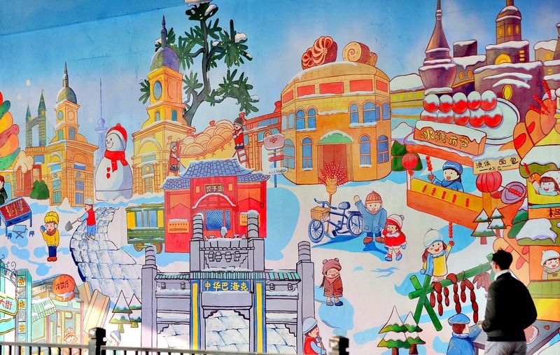 彩繪里有亞冬會(huì)冰雪運(yùn)動(dòng)元素,有中央大街、索菲亞教堂、雪花摩天輪、太陽(yáng)島、中華巴洛克街區(qū)、東北虎林園、網(wǎng)紅大雪人等哈爾濱地標(biāo)建筑和景區(qū),還有冰糖葫蘆、格瓦斯、紅腸、凍梨和凍柿子等冰城特色美食。