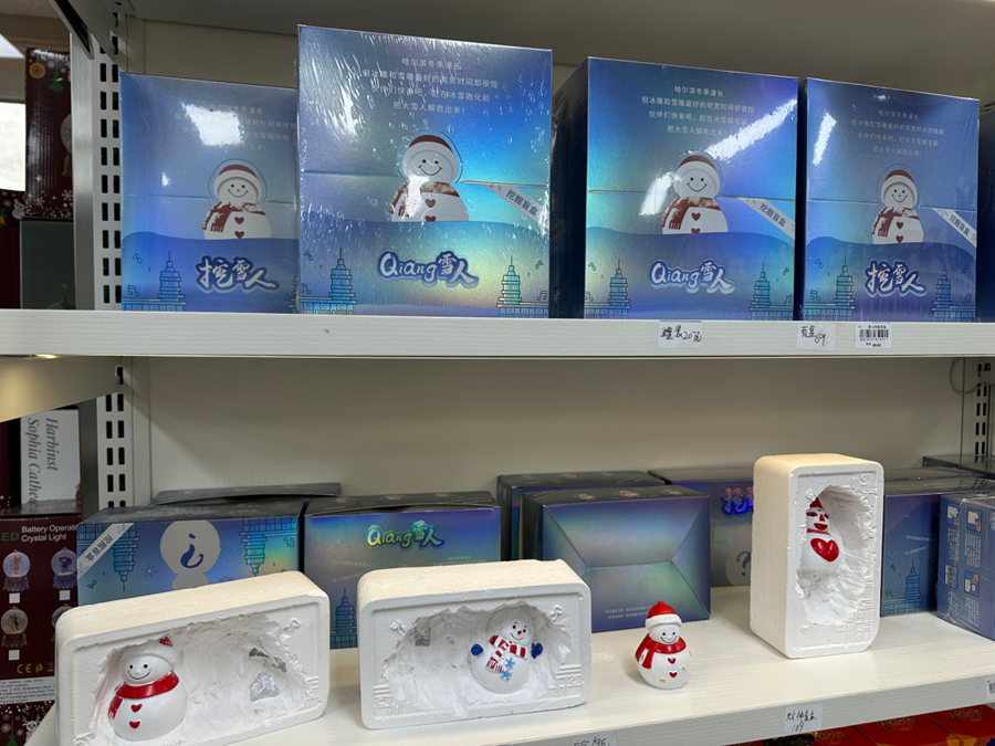 1月26日,哈爾濱群力音樂公園附近一家文創(chuàng)商店銷售的“挖雪人”盲盒。新華網(wǎng) 邱虹攝